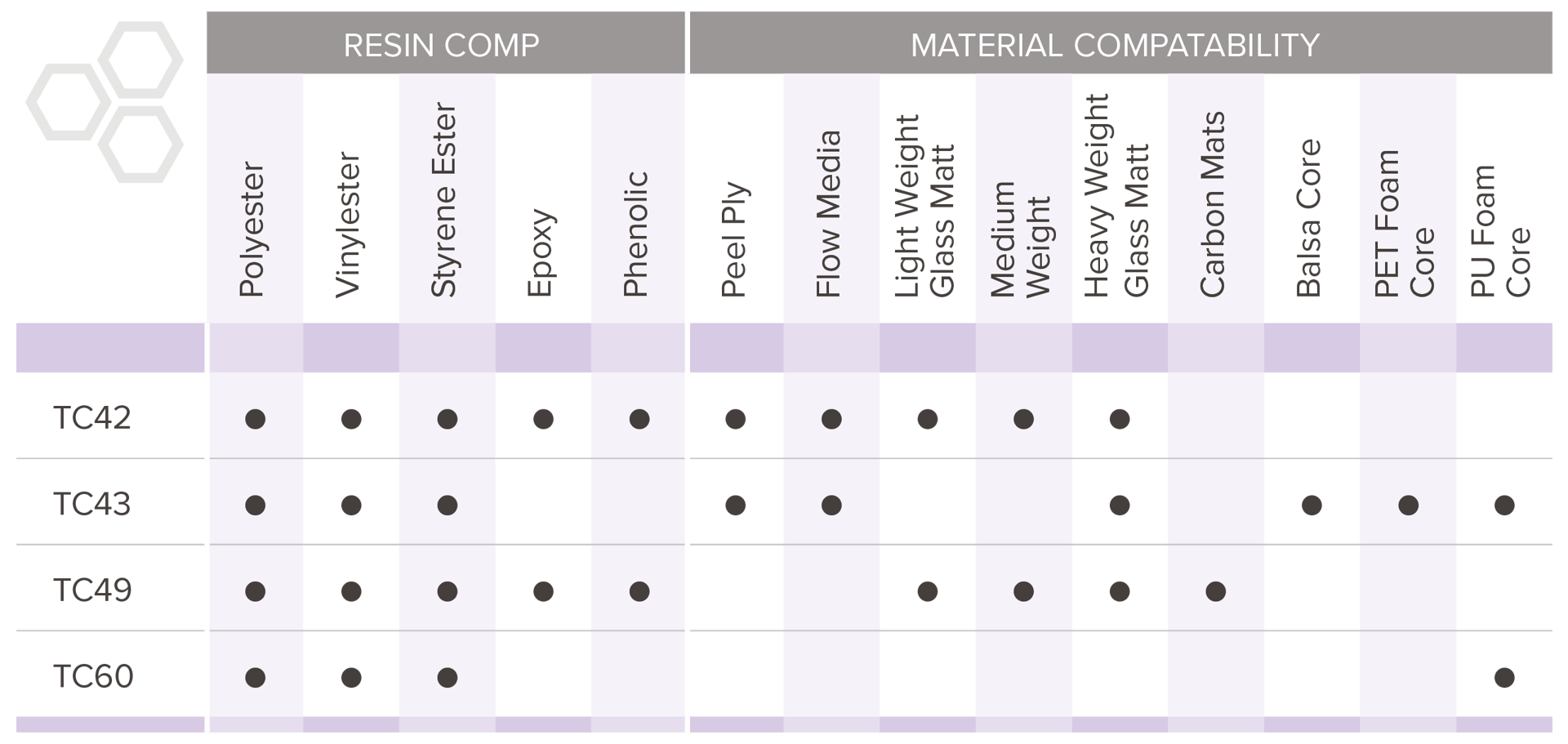 Working in infusion RTM? Consult the product matrix below for an overview of our products and their applicable dry layup materials: