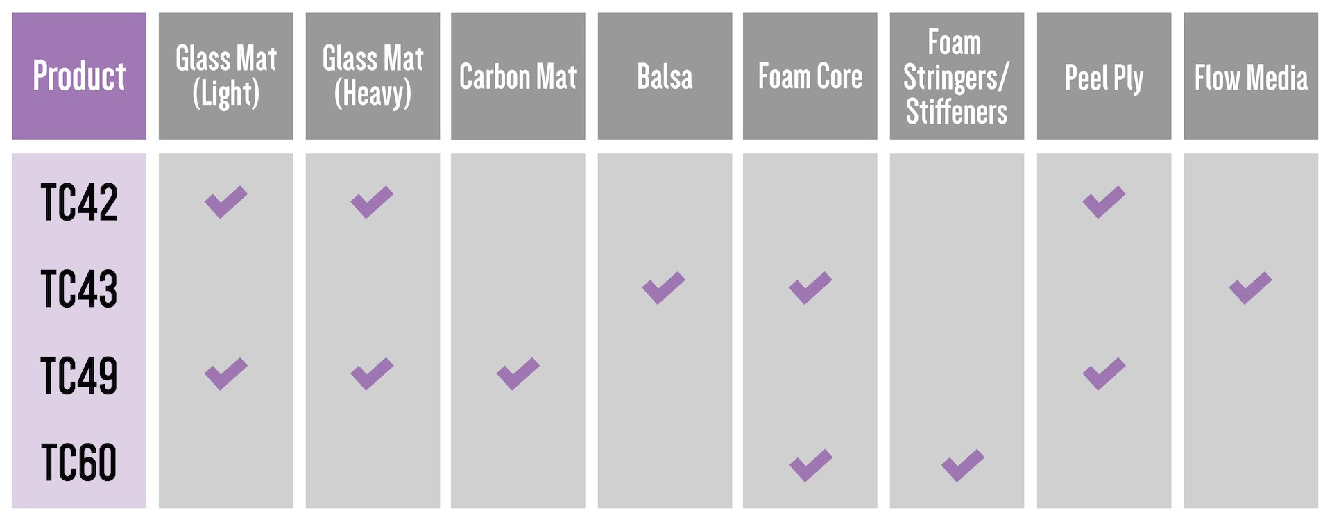 Our experience in these industries has allowed us to develop an unrivalled understanding of adhesive requirements in relation to composites manufacturing processes. We have taken this understanding forward by engineering a range of solutions that are designed for application across a variety of materials used in composites manufacturing. See more in the matrix below: